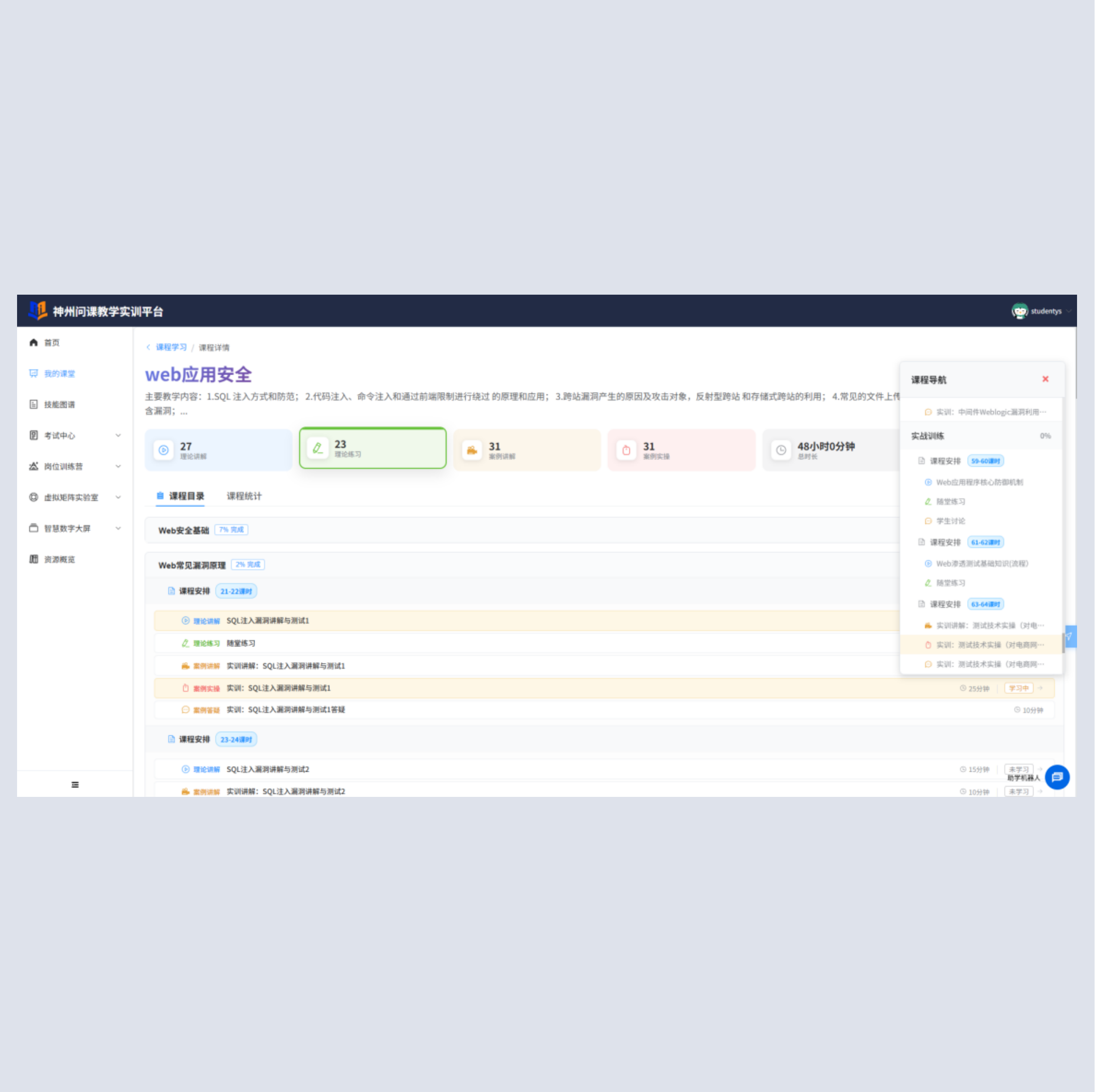 教师可基于平台开放的资源管理功能,自由创建、上传、编辑实训课程资源,组建属于自己的个性化实训资源库,资源类型支持课件、视频、文档、镜像文件、拓扑图、测评题库等多种形式。平台内置 100 + 门优质实训课程资源,涵盖网络搭建、安全攻防、软件开发、人工智能等多个方向,教师可直接引用或二次修改,大幅节省实训课程开发时间。