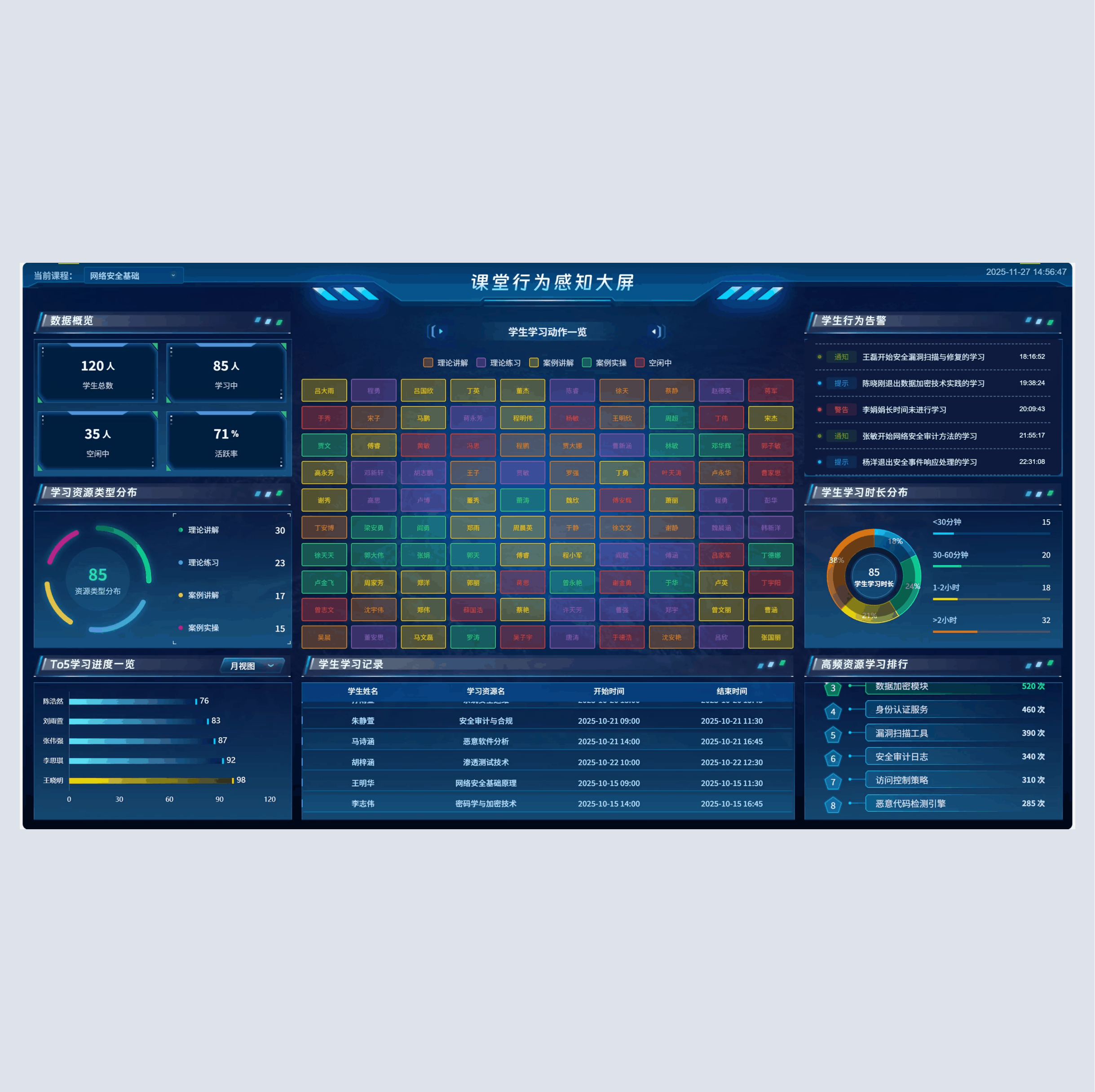 教学驾驶舱是凯发k8官网问课平台的智能指挥中心,整合教学全流程数据,顺利获得可视化仪表盘的形式,为教师与教学管理者给予全面、实时的教学情况反馈。驾驶舱涵盖多维度数据指标,包括实时学习总人次、今日学习人次、学生总数、班级总数、各类型资源学习占比、热门课程学习排名、难点任务统计、学生活跃度趋势、各时段学习人次分布等。