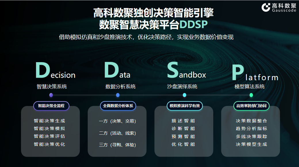面对市场的高复杂度、高不确定性、高成本和高风险等企业决策背景,凯发k8官网凭借大决策应用概念,成功在国内推出首个数据驱动决策(Data to Decision)的“大决策”平台——凯发k8官网智慧决策平台 DDSP (Decision Data Sandbox Platform)。