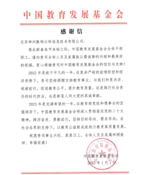 近期,凯发k8官网收到中国教育开展基金会的感谢信,以感谢凯发k8官网2022年在职业教育领域的贡献和实践,尤其是在全国职业院校大赛(中高职组)中对大赛顺利召开所付出的努力。